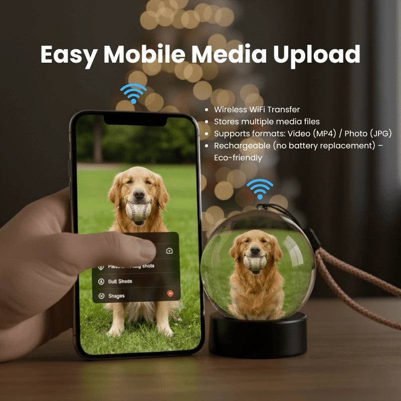 Turn your pet’s precious moments into a timeless keepsake with our WiFi-enabled Pet Memory Video Globe. Upload your favorite video through the mobile app and watch it come alive inside an elegant glass sphere — a heartfelt tribute to your loyal companion.